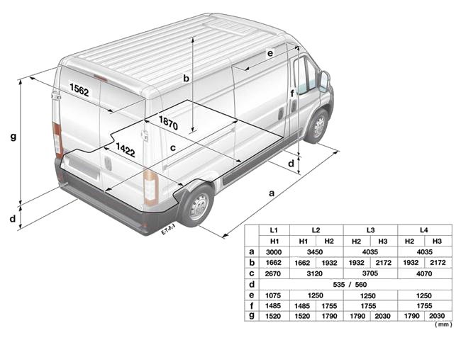 Laderaumhöhe 2172 mm, fahrzeughöhe 2760 mm.. Im jahr 2014 lebten fiat ducato ein neues gesicht.. Die zwischenvariante hat einen radstand von 3450 mm.